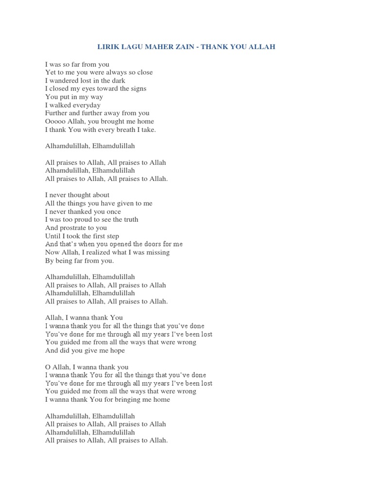 Allahi Allah Kiya Karo. Lirik Lagu Maher Zain - Thank You Allah dan terjemahan Unknown Monday 18 April 2016 I was so far from you Aku begitu jauh dari-Mu Yet to me you were always so close Sebelumnya Engkau selalu begitu dekat I wandered lost in the dark Aku mengembara tersesat dalam gelap I closed my eyes toward the signs Aku memejamkan mata ke arah tanda-tanda. YOU put on my way I walked everyday Further and further away from YOU Allah YOU brought me home I thank YOU with every breath I take Alhamdu lelah x2 All praises to Allah x2 Alhamdu lelah x2 All praises to Allah x2 I never thought about All the things YOU have given to me I never thanked YOUR warns I was too proud to see the truth And prostrate to YOU.